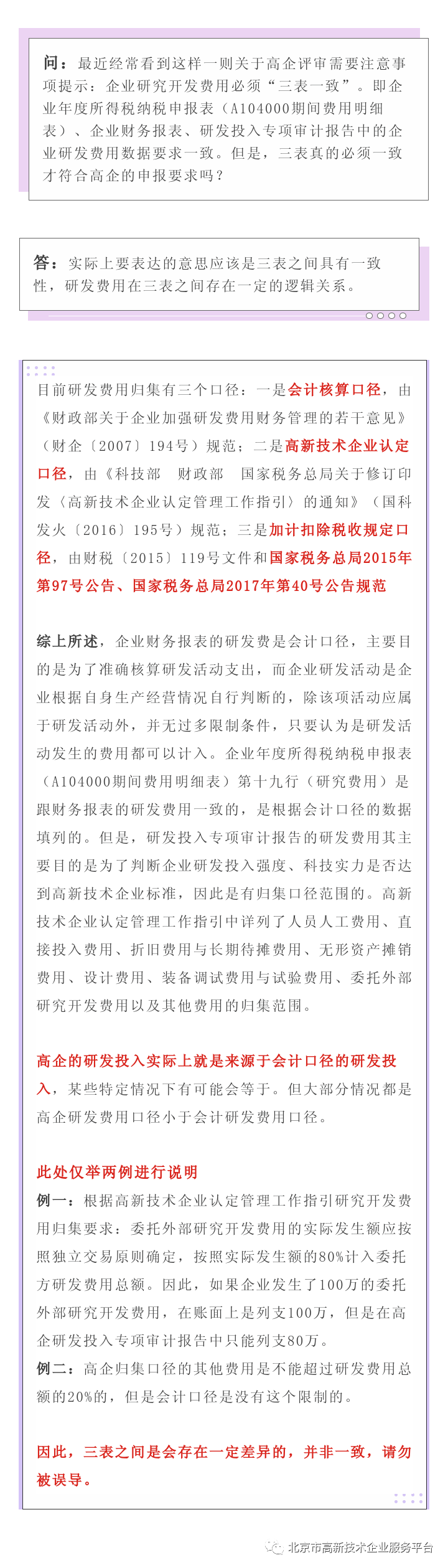 答:目前北京海淀区针对辖区申报企业,每年常态化提供相关免费服务,并委托中关村高新技术企业协会针对相关企业开展系列免费培训和全流程申报辅导,促进企业合规申报高新技术企业认定。其他区业务主管部门也会组织类似的政策培训和指导工作。“三表一致”的问题,高新技术企业认定的口径是什么?